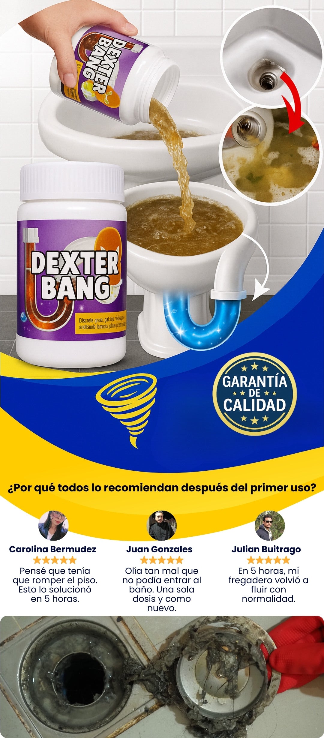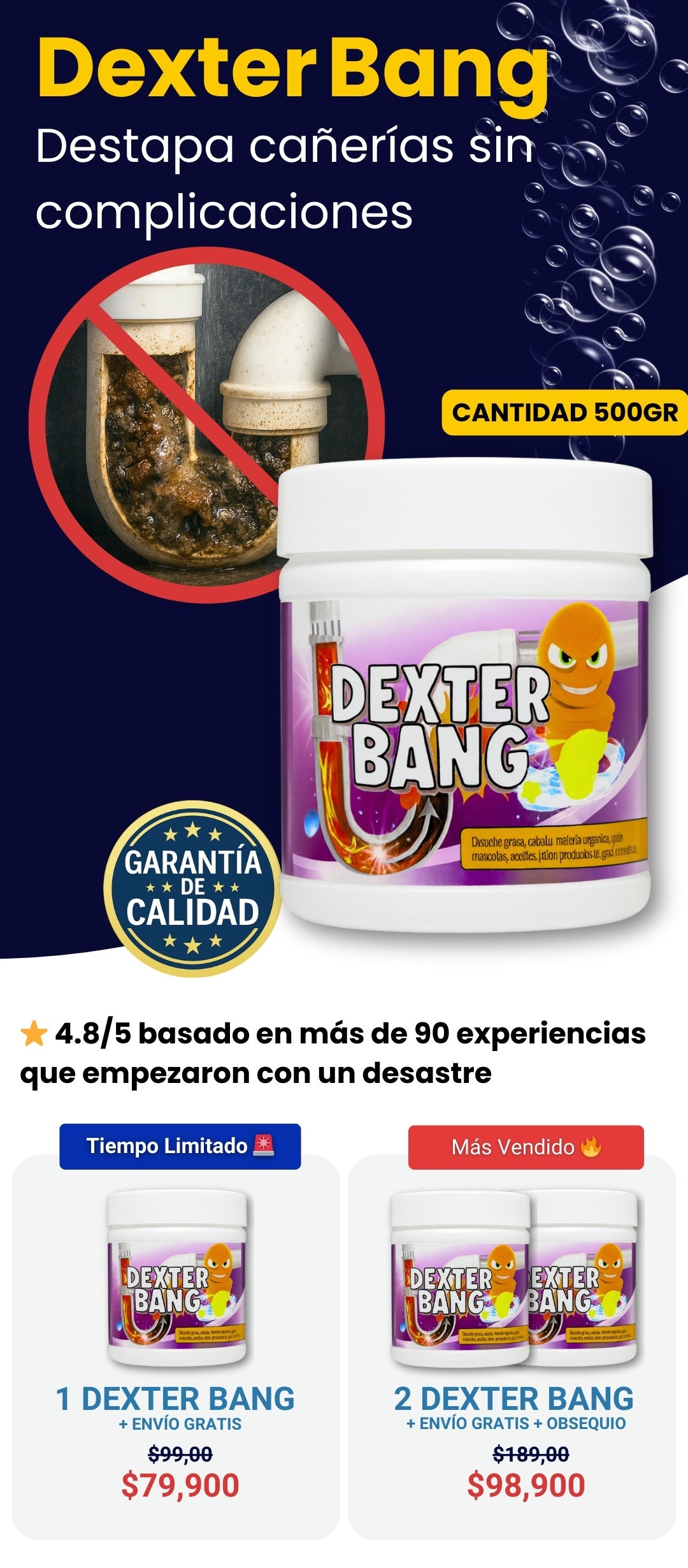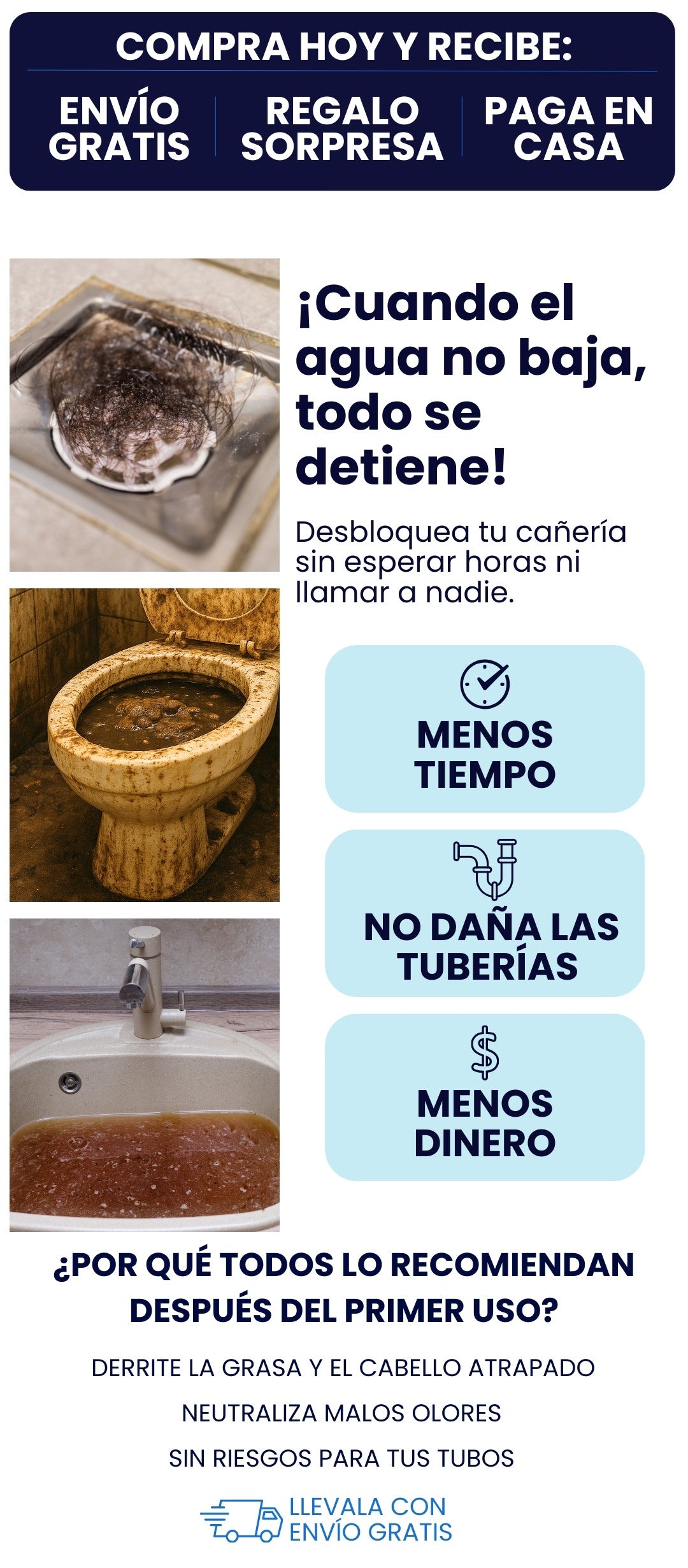 En lavamanos o ducha con atasco leve, una porción; en bloqueos mayores, usa más y espera más tiempo.