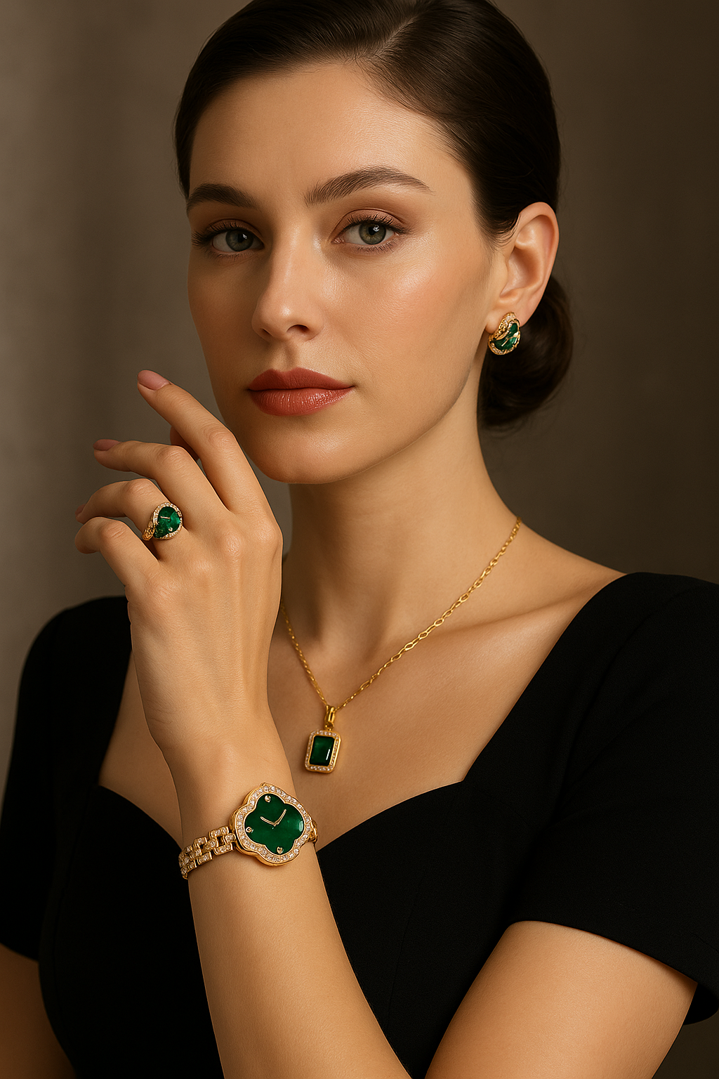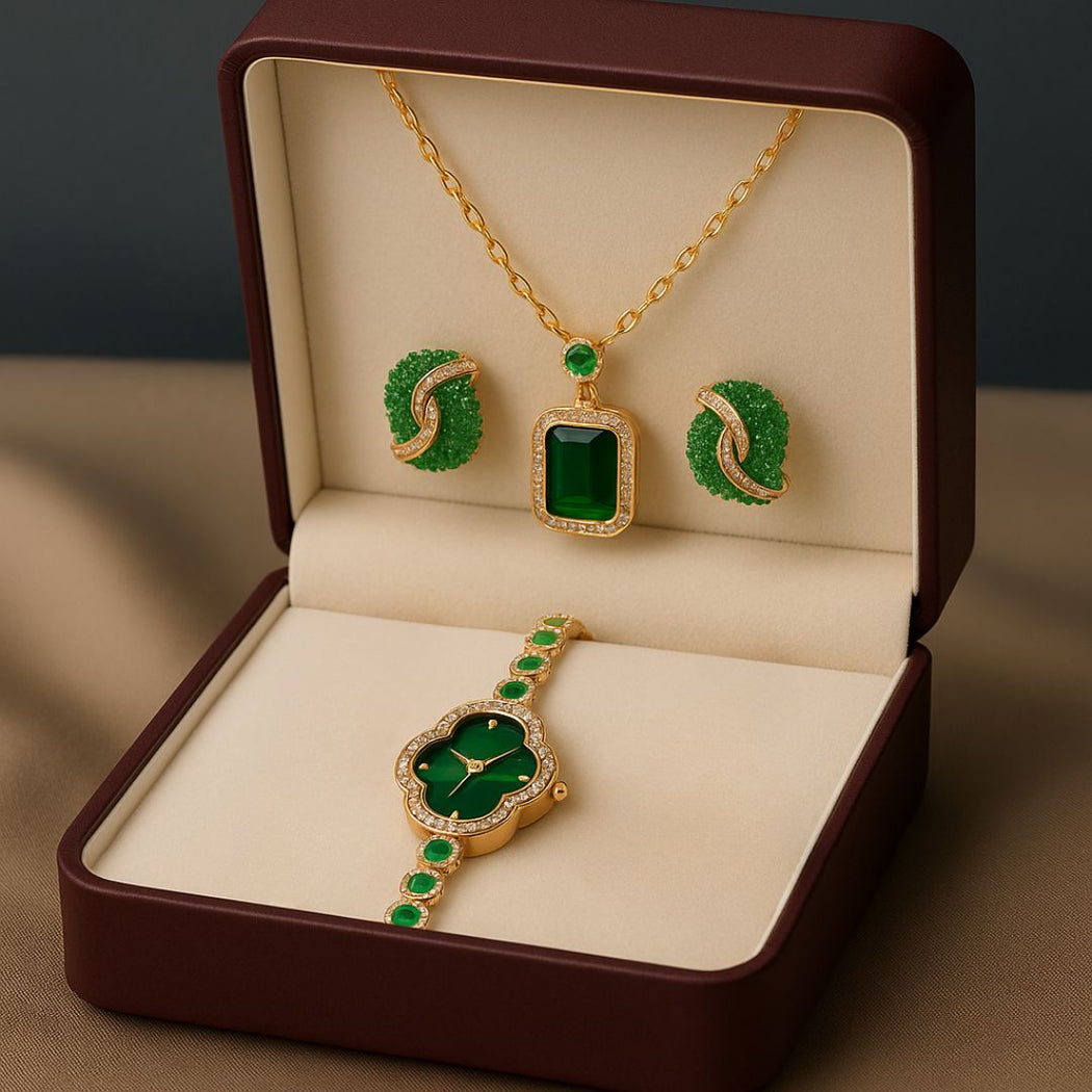 IMAGINA A ESA PERSONA QUE MÁS AMAS BRILLANDO CON ESTE EXCLUSIVO SET DE LUJO, ELEVANDO SU BELLEZA CON CADA DETALLE EN VERDE ESMERALDA.