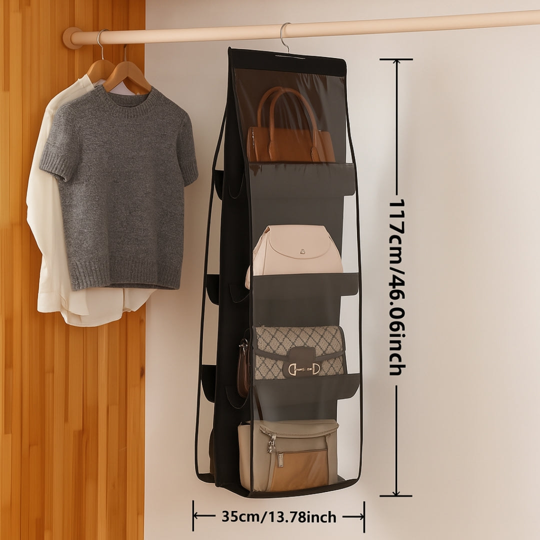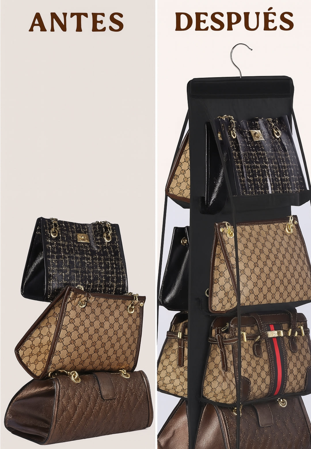 - Diseño vertical con 8 bolsillos individuales: ideal para mantener tus bolsos protegidos, visibles y organizados sin apilarlos ni maltratarlos.